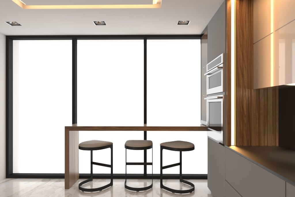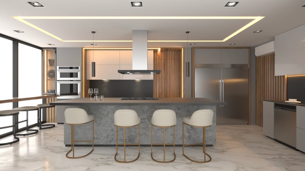 Cocina moderna con isla central, almacenamiento inteligente y un encantador desayunador con vista al mar.